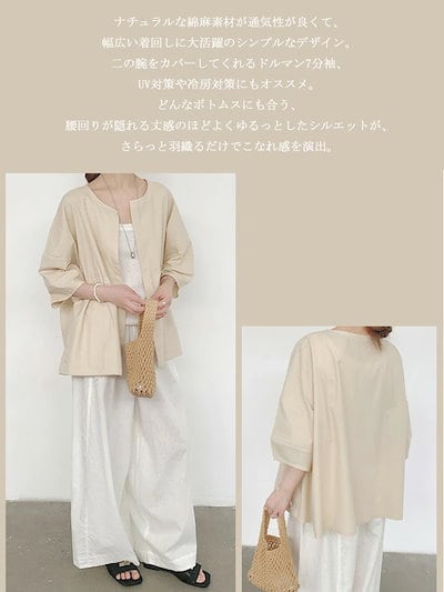 カーディガン レディース 綿麻 コート ジャケット 七分袖 アウター トップス ライトアウター パーカー 春 夏 上着 前開き 羽織り ブラウス 半袖ジャケット ゆったり ノーカラー リボン ぽんわ袖