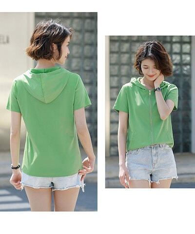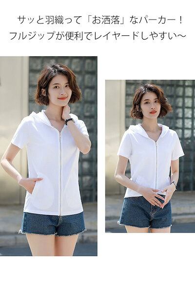 半袖 パーカー ジップアップ レディース 春夏 トップス ライトアウター 羽織り 半袖パーカー 前 開き 薄手 ジップ フルジップ フード付き ポケット 綿 コットン カーディガン レイヤード フーデ