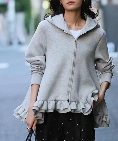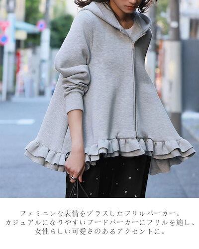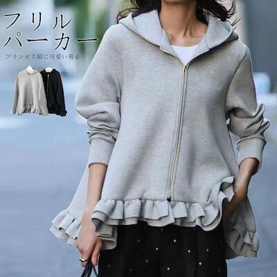 パーカー レディース 秋 おしゃれ アウター ショート丈 トップス 長袖 フリル パーカー スウェット風パーカー フリルパーカー コート ジャケット フード 無地 カジュアル ゆったり 体型カバー フ