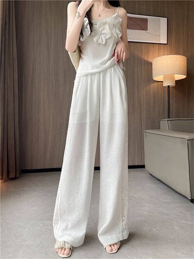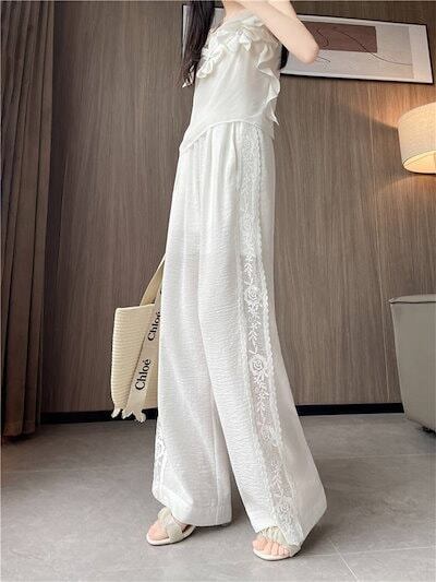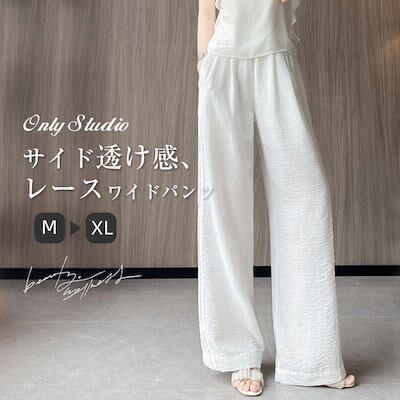 パンツ レース ワイドパンツ レディース 新作 チノパンツ 透かし編み サイドレース 薄手 裏地付き ロングパンツ ボトムス デザイン感 ストレートパンツ ワイド ハイウエスト 体型カバー 春 夏 着