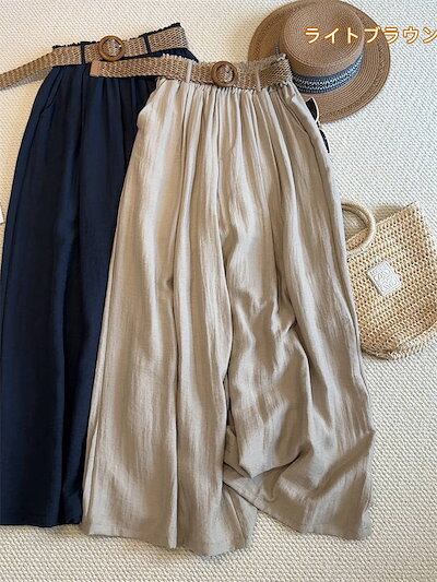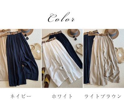 ワイドパンツ ベルト付き レディース 新作 パンツ 無地 薄手 涼しい ロングパンツ 綿麻風 ガウチョパンツ 長ズボン ボトムス 涼感 春 夏 秋 ハイウエスト ウエストゴム イージーパンツ ゆったり