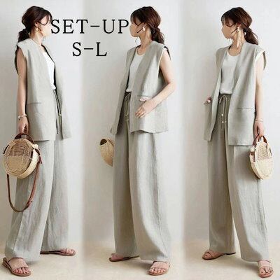 セットアップ テーラードジレ ベスト 羽織り ワイドパンツ 上下セット 無地 ゆったり カジュアル 通勤 オフィス キレイめ レディース 大人モード こなれ感 着回し おしゃれ 夏 夏服