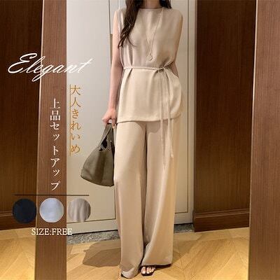 パンツセットアップ レディース 夏 上下セット 2点セット ワイドパンツ タンク シャツ ブラウス 袖なし ノースリーブ カジュアル 通勤 オフィス きれいめ 無地 ロングパンツ 体型カバー 着痩せ