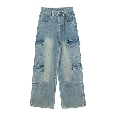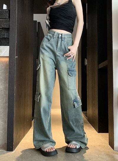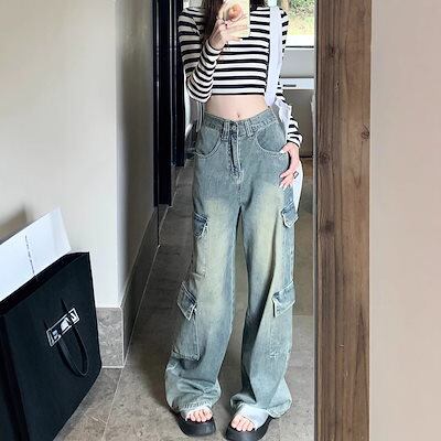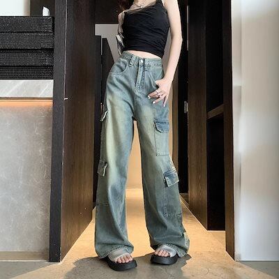 デニムパンツ 2025春夏新作レトロハイウエストデニムワークウェアワイドパンツ