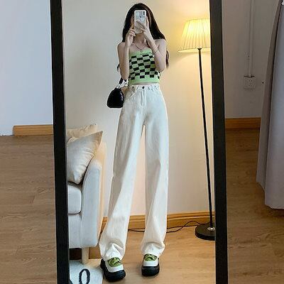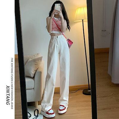 デニムボトムス レディースホワイト ハイウエストワイドデニム デニムパンツ 女性 小柄 秋ゆったりストレートドレープパンツ ジーンズ ボトムス 美脚 デニムパンツ