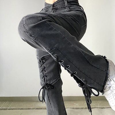 デニムパンツ ニッチデザイン レースアップ ジーンズ レディース イン 春 ファット ハイウエスト スリム スリット ワイドパンツ 潮
