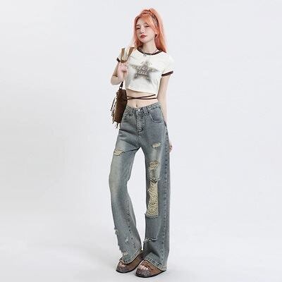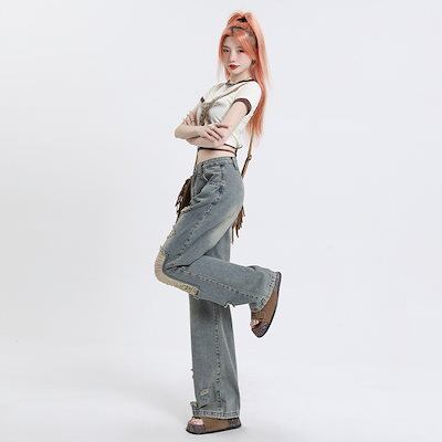デニムパンツ レディース透かし彫り百掛け 着痩せ ジーンズ ロングパンツ レディース服 デザイン感 ハイウェストゆったり 長ズボン ロングズボン ワイドパンツ
