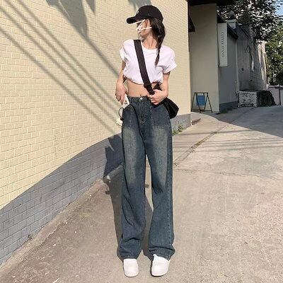 Qoo10限定 デニムパンツ レディース 2025春秋ハイウエストスリムワイドパンツ ジーンズ ボトムス 美脚 ワイドパンツ