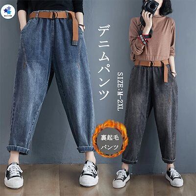 パンツ 裏起毛 デニムパンツ レディース デニム パンツ ボトムス ズボン 冬 防寒 秋冬 無地 ロングパンツ ボア 裏ボア ハロンパンツ ロングパンツ ウエストベルト 体型カバー ワイドパンツ ハイ