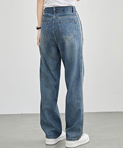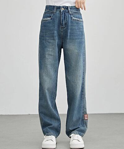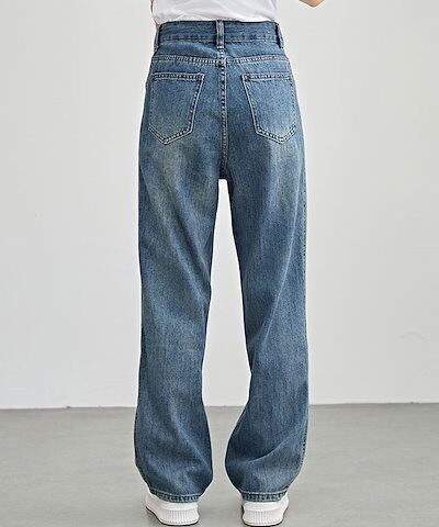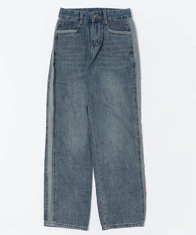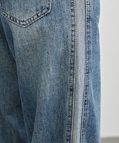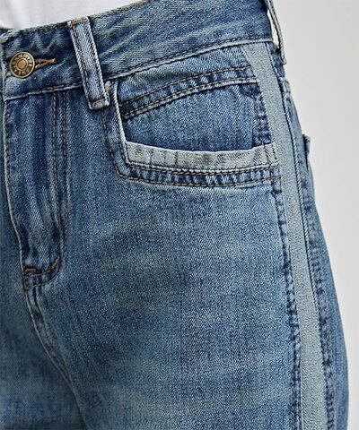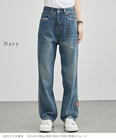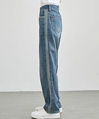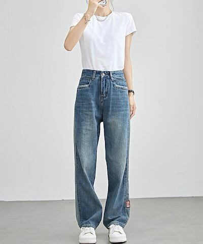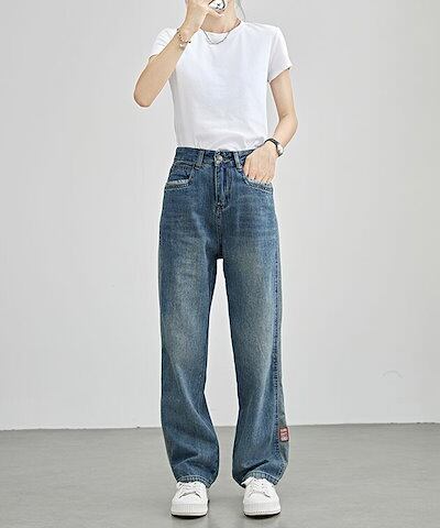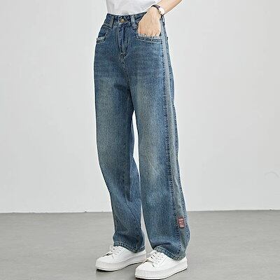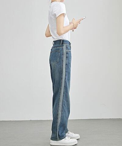 配色 ライン パッチワーク ストレート デニム パンツ 女性 レディース ボトム ズボン Gパン 春 夏 秋 冬 ジーパン 脚長効果 腰高設計 ハイウエスト セミワイド ベーシック カジュアル トレン
