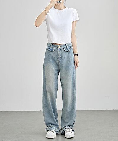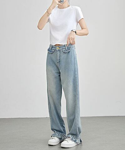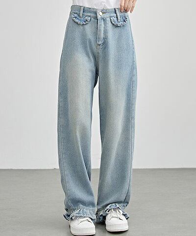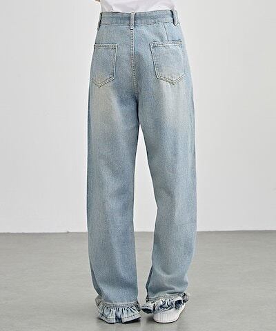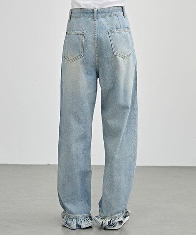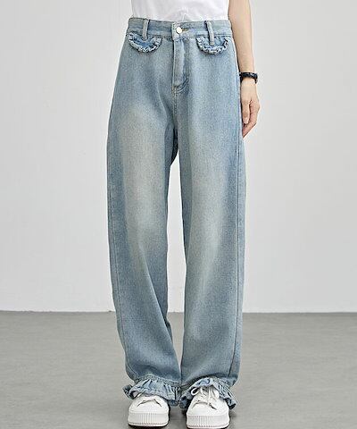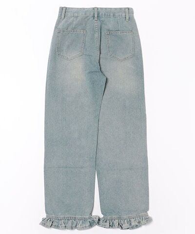ハイウエスト セミワイド フリル デニム パンツ 女性 レディース ボトム ズボン ジーンズ Gパン 春 夏 秋 冬 脚長効果 フレア カジュアル アクティブ デイリー 定番 可愛い キュート ガーリ