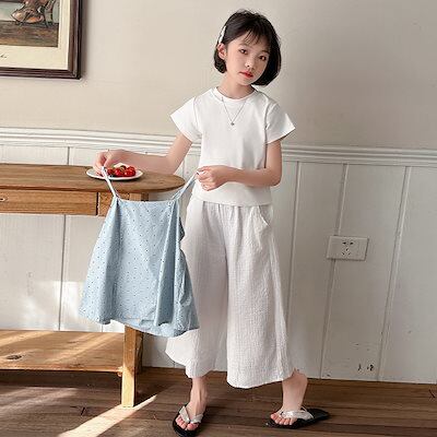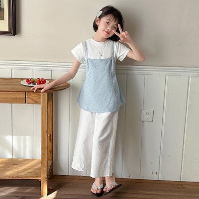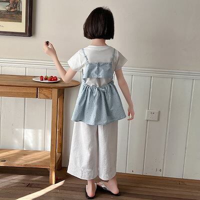 女の子のスーツの夏の女の子の大きい子供の半袖のtシャツの韓国版のカジュアルなサスペンダーのワイドパンツの夏の3つのセット