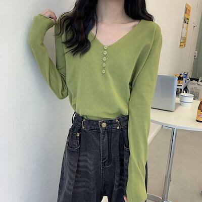 人気なリブニット Tシャツカットソー Vネック ニットアンダーウェア レディース 秋 新作 韓国ファッション アウター カジュアル 百掛け 長袖トップス