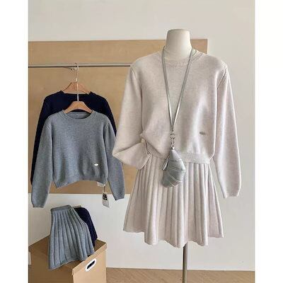 セットアップ 秋冬 ニット セット商品 レディース 無地 ラウンドネック ジャンパー プリーツスカート ツーピースタイド