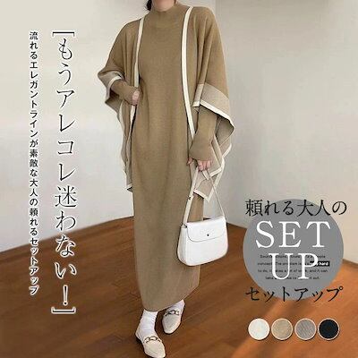 2025新作 韓国風ニットセットアップ ニットワンピース レディース ワンピース ロングワンピース フレアーワンピース フレアー 2点セット 秋 冬 ケープ ロング 膝下 長袖 ハイネック 無地 カジ