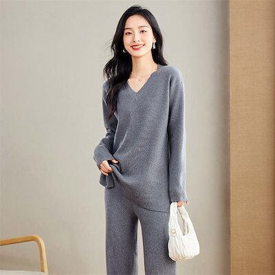 2025新作 韓国風ニット セットアップ パンツ ニットパンツ レディース きれいめ 秋冬 長袖 冬 Vネック ウール セーター ワイドパンツ ワンマイルウェア 2点セット 上下セット ロングパンツ