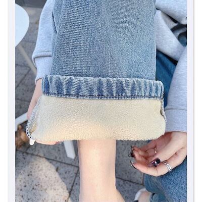 裏起毛ルーズ ウォッシュ加工 デニムレディース 秋冬 ハイウエスト ゆったり快適ストレートパンツ