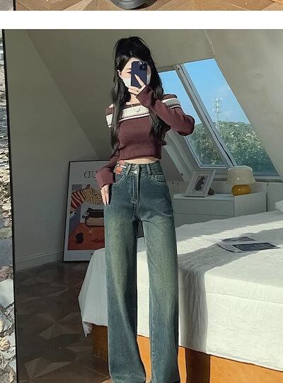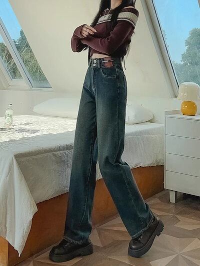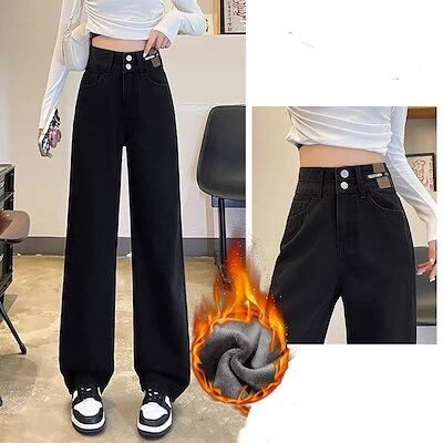 レディース 秋 冬 ハイウエストストレートデニム韓国ファッション着痩せ脚長効果裏起毛ロングパンツ