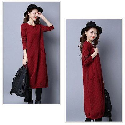ロングワンピース レディース 秋冬 ワンピース チュニック 厚手 長袖 Vネック ミモレ丈 体型カバー ゆったり キルティング 大きいサイズ 無地 着痩せ 暖かい OL 通勤 リラックス オフェンス