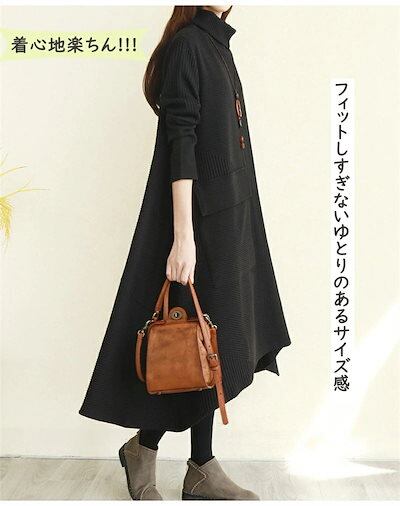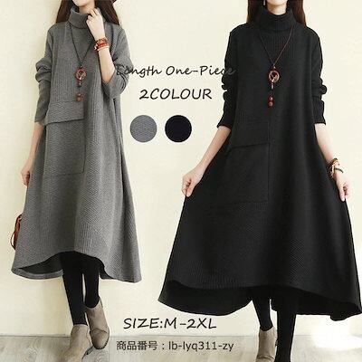 ワンピース レディース 秋冬 ロングワンピース 長袖 チュニック ロングワンピ ミモレ丈 タートルネック 無地 マキシワンピース 大きいサイズ 体型カバー ハイネック フレア Aライン 前後差あり お