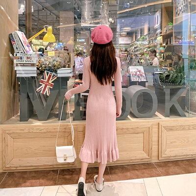 ニットワンピース ワンピース レディース ニット Aラインワンピース リブニット ロングワンピース 長袖 クルーネック 秋 冬 ロングワンピ ニットワンピ ニットセーター フレア フレアワンピース