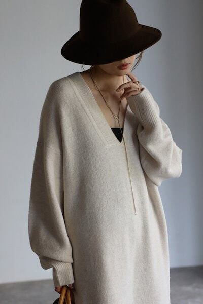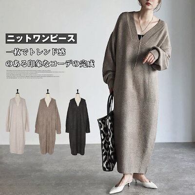 【9月新作】ニットワンピース レディース トップス 秋冬 長袖 厚手 vネック ニットワンピース 大きいサイズ ビッグシルエット