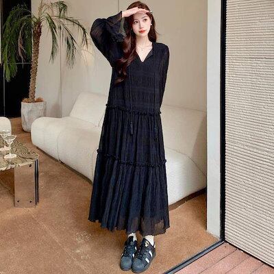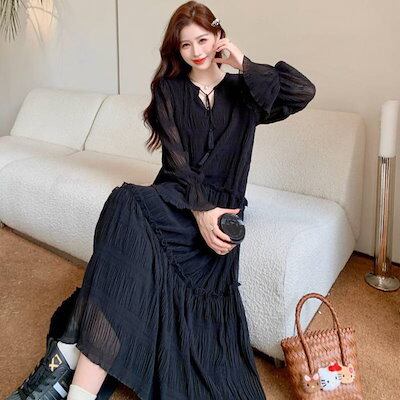 【9月新作】ワンピース レディース Vネック ロングワンピース フレア袖 ワンピース 秋冬 春 長袖 ブラック きれいめ ゆったり