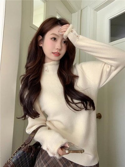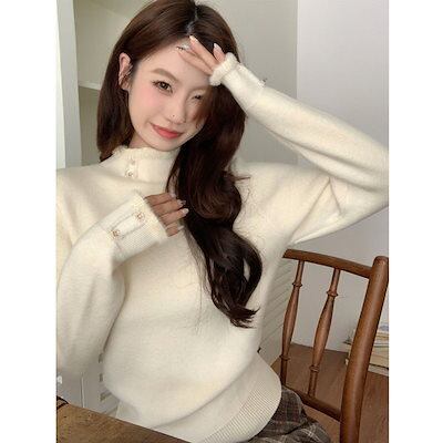 韓国ファッション レトロ ハイネックセーター 秋冬新作 厚手 長袖ニット レディース 裏起毛 セーター プルオーバー トップス