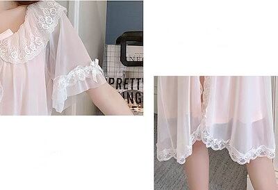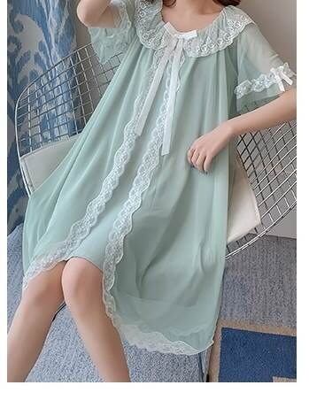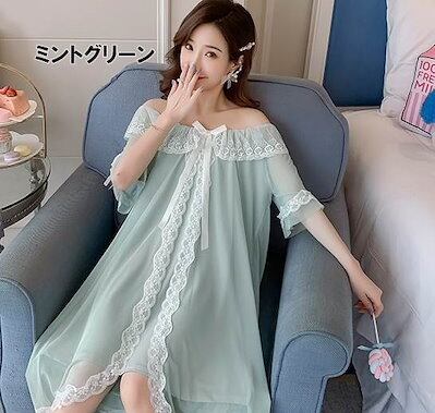 1〜3日で出荷超3色もパジャマワンピースルームウェアレディースセクシーリボンシフォン五分袖ひざ下丈フリルレース透け感シアーシースルー甘め春夏部屋着ラフナイトウエア