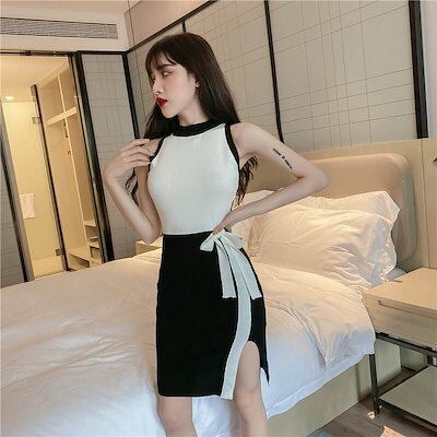 1〜3日で出荷驚きの安さ2色キャバがドレスワンピースレディースミニ丈膝丈ひざ丈バイカラーリボン黒白ベージュセクシーワンピ大人可愛いノースリーブキャバ嬢ハイネックサイドスリット個