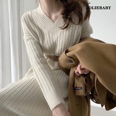 ワンピース ニット ひざ丈 Vネック レディース 長袖 無地 お洒落 秋 冬 きれいめ カジュアル シンプル 可愛い 20代 30代