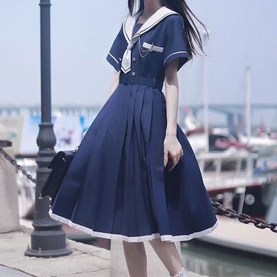 セーラー服コスプレ量産型地雷ハロウィンかわいいリボン白青服レディースセットアップセーラー襟半袖ひざ丈ミモレ丈可愛いワンピースセーラー服風個性的参戦服ゆめかわいいやみかわいいネクタイプ
