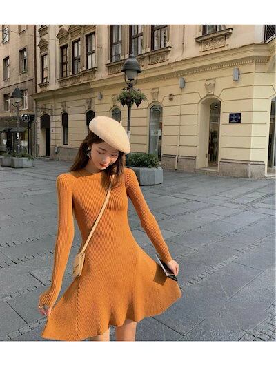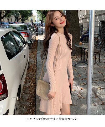 【急速出荷】リブ ニットワンピース 膝丈 ワンピース レディース ニットワンピース ひざ丈 クルーネック ワンピース ニット ニットワンピ 膝丈 長袖 上品 シンプル 秋冬 無地 体型カバー オシ