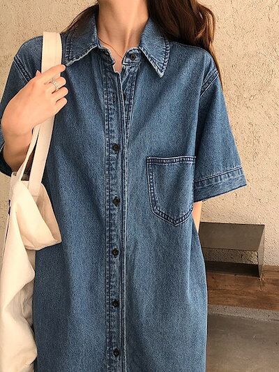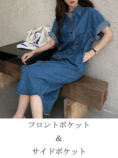 デニムワンピース レディース 半袖 ワンピース 春夏 ロングワンピース デニム シャツワンピース Aライン ロング丈 マキシ丈 ストレートワンピース 薄手 ポケット付き 前開き 膝下 ひざ下 シンプ