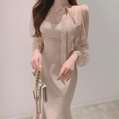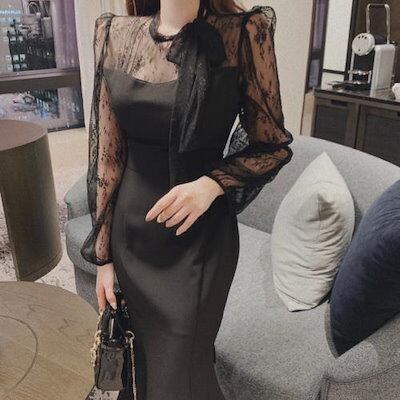 タイトドレス白黒ピンクボウタイワンピースミモレ丈ひざ下丈セクシーレディースブラックドレスホワイトドレス長袖可愛いお呼ばれ結婚式二次会披露宴成人式キャバドレスブラックパーティードレス韓国マーメイドマ34