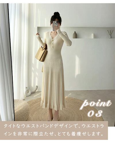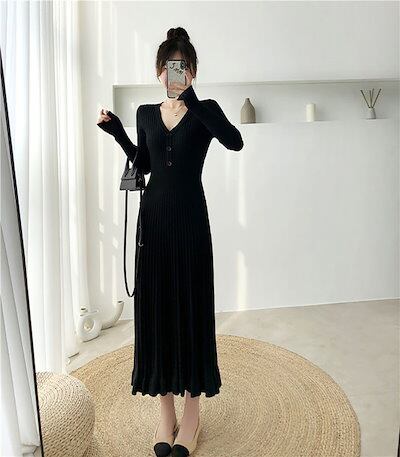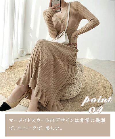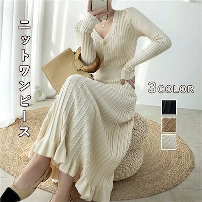 【赤字販売*速達】マーメイドニットワンピース レディース プリーツワンピース フレアワンピース リブニット Aライン Vネック ボタン ゆったり ひざ下丈 体型カバー 着痩せ ストレッチ素材 マキシワ