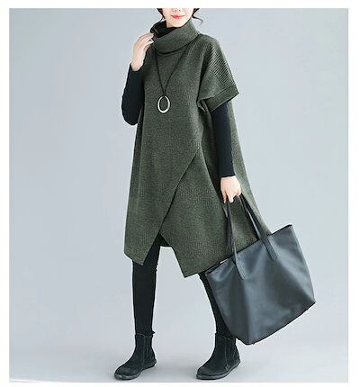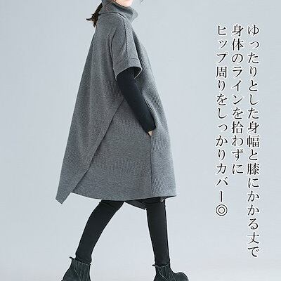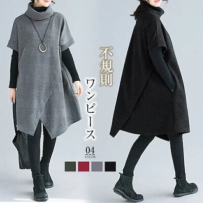 チュニック ワンピース レディース 秋冬 ひざ丈 膝丈 ニットワンピース タートル ネック 暖か 斜めスリット アシンメトリー 厚手 防寒 黒 Aライン ハイネック 体型カバー 大きいサイズ 着痩せ