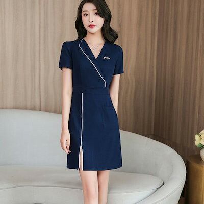 !サロン エステティック レディース ユニフォーム 女性 ウェストシャープ 半袖 美容 ワンピース 膝丈 ひざ丈 Vネック サロンウェア クリニック 女性 エステ 制服!サロン エステティック