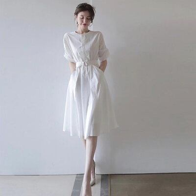 ひざ丈ワンピース レディース ホワイトワンピース シャツワンピース 7分袖 ノーカラー 無地 ホワイト 白 膝丈 体型カバー きれいめ 着?せ カジュアル ポケット付き しゃれ 通勤 フレア Aライン