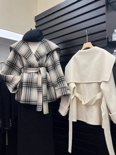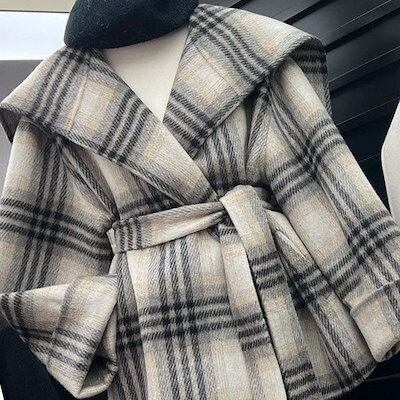 2024韓国スタイルの小さな香りのウエストウールコート女性用のハイエンドレディライクチェック柄ウールコート