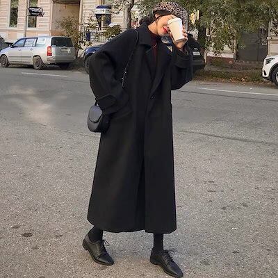 ヘボン風ミドル丈ブラックウールコートレディース2024人気新作カジュアル韓国ウールコート
