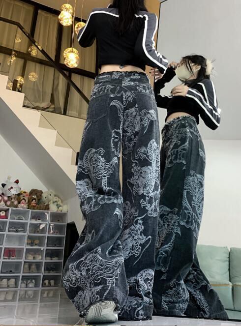 レディース ボトムス ジーンズ ズボン デニム ユニセックス ワイドパンツ 龍