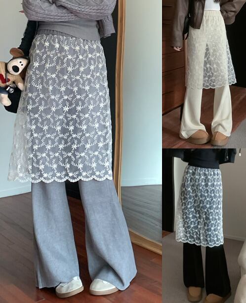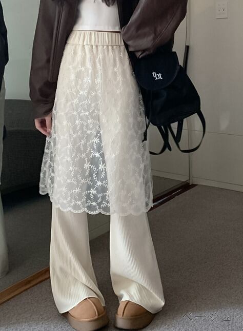 全3色 ワイド バギーパンツ フェイク 切り替え 体型カバー 着痩せ レース カジュアル