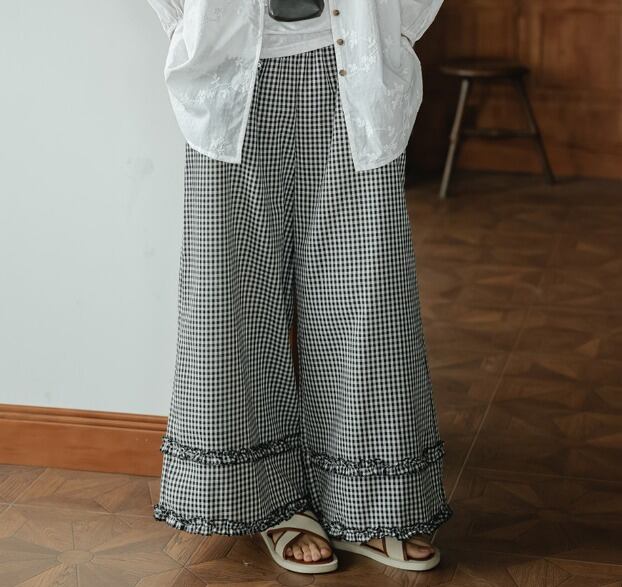 ワイド バギーパンツ 切り替え バイカラー 体型カバー 着痩せ チェック柄 カジュアル