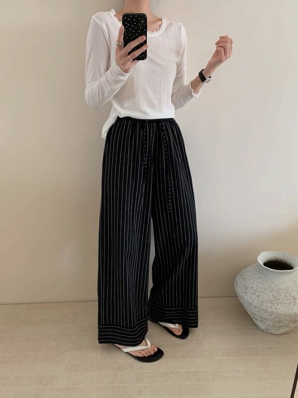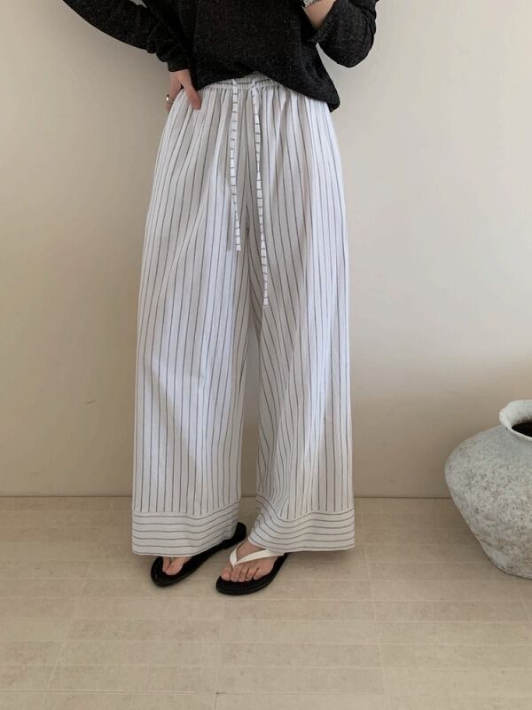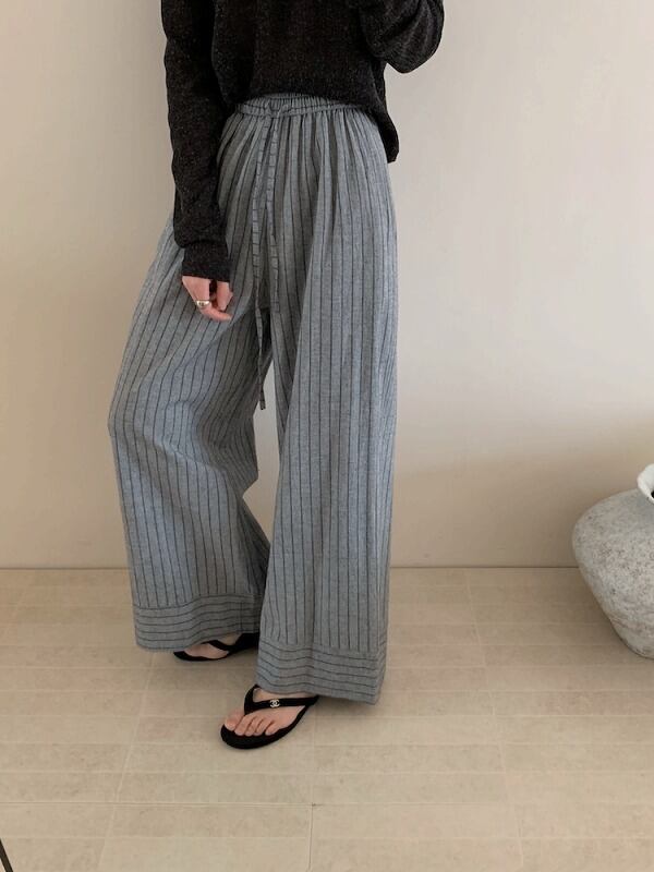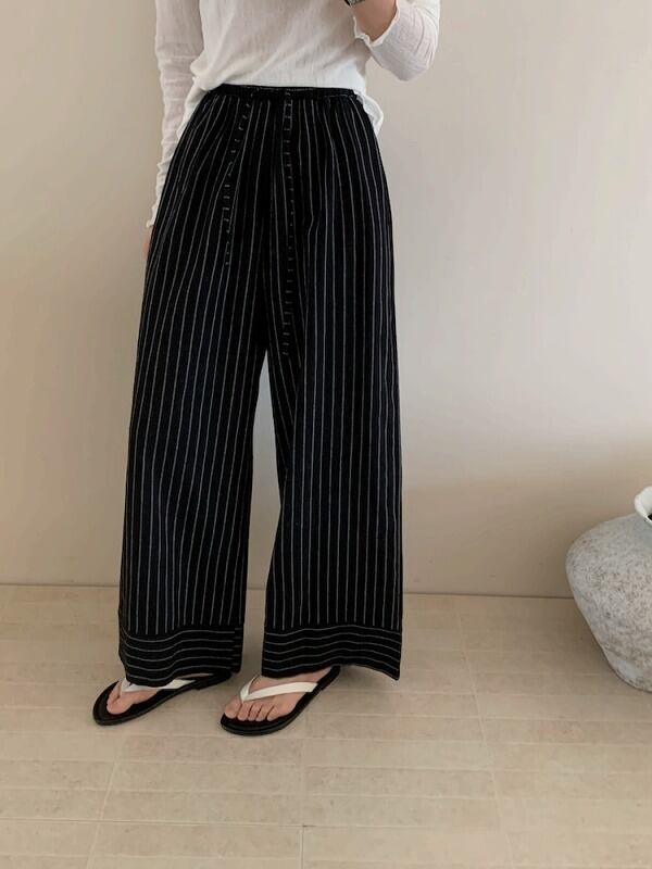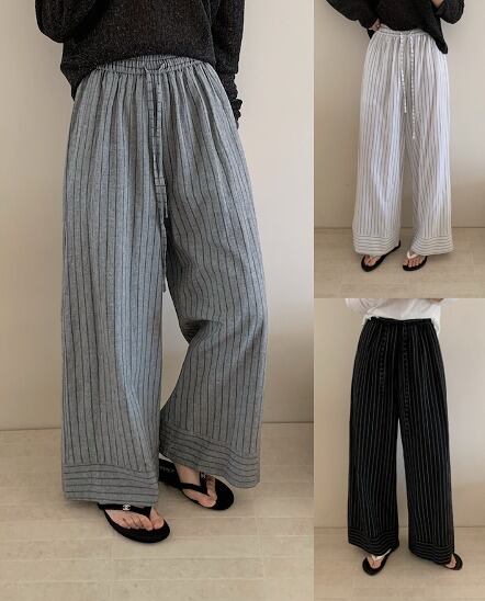 全3色 ワイド バギーパンツ 切り替え バイカラー 体型カバー 着痩せ ストライプ柄 シンプル カジュアル