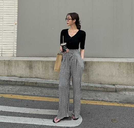 ワイド バギーパンツ 切り替え バイカラー 体型カバー 着痩せ チェック柄 シンプル カジュアル