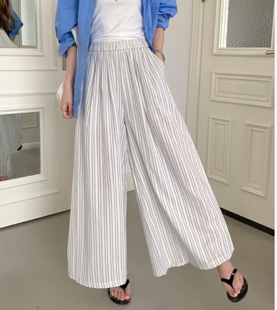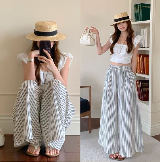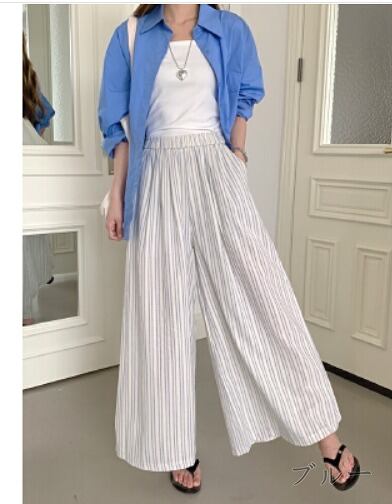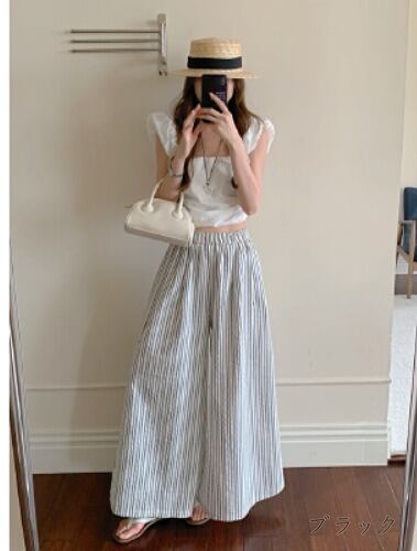 全2色 ワイド バギーパンツ 切り替え バイカラー 体型カバー 着痩せ ストライプ柄 カジュアル