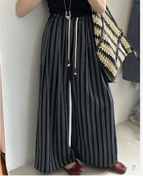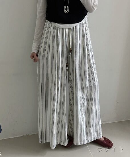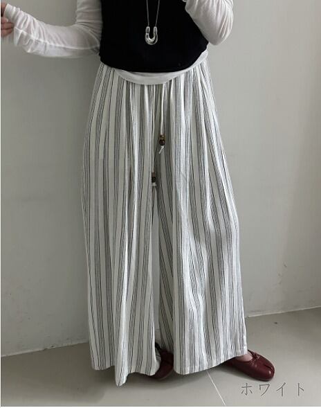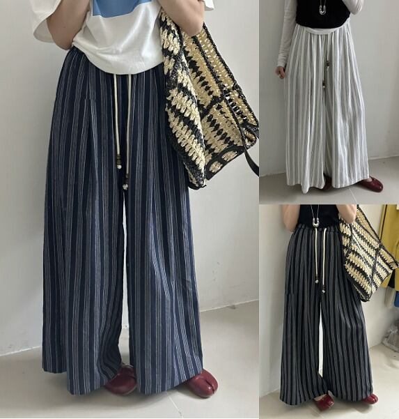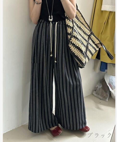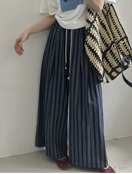 全3色 ワイド バギーパンツ 切り替え バイカラー 体型カバー 着痩せ ストライプ柄 カジュアル