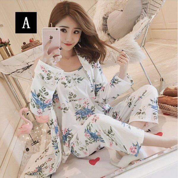 パジャマ レディース 春夏秋 3点セット 花柄 キャミソール 長ズボン カーディガン 長袖 プリント