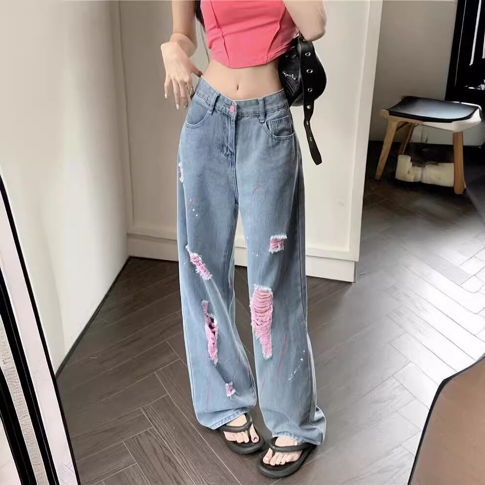 2024秋新作 韓国風 ジーンズ ロングパンツ 長ズボンハイウエスト美脚 ダメージデニムパンツ